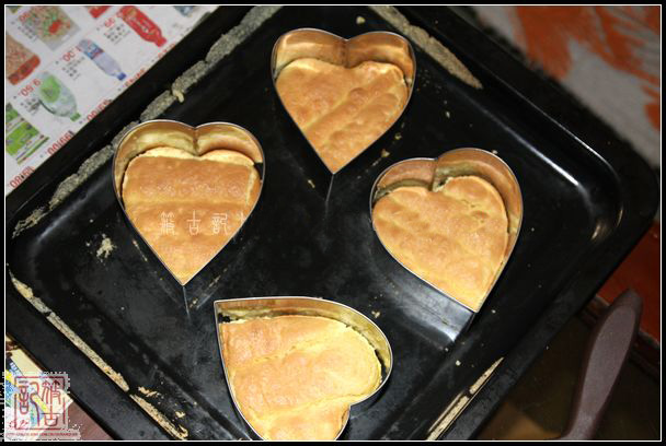 2.用心形切模取四個蛋糕底備用。
