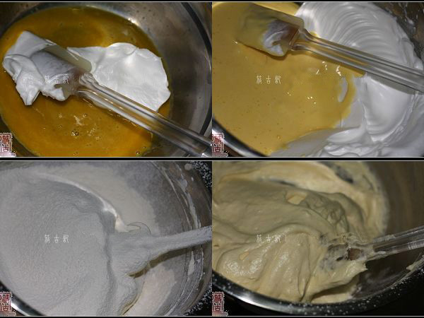 1.分蛋海綿底:蛋黃拌勻即可,蛋白分次加入100克細砂糖,打至硬性發(fā)泡,挑出一部分蛋白,和蛋黃拌勻,倒回蛋白盆中,徹底拌勻,低粉篩入蛋糊中,用刮刀切拌均勻。烤箱預(yù)熱180度,將蛋糕糊倒入烤盤中,上下火烤10分鐘左右至表面上色即可。