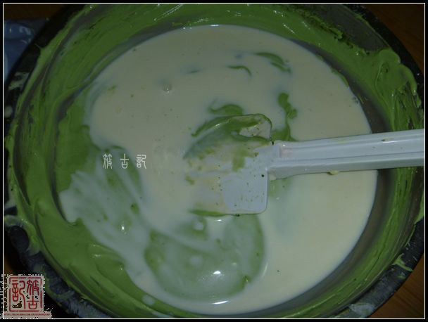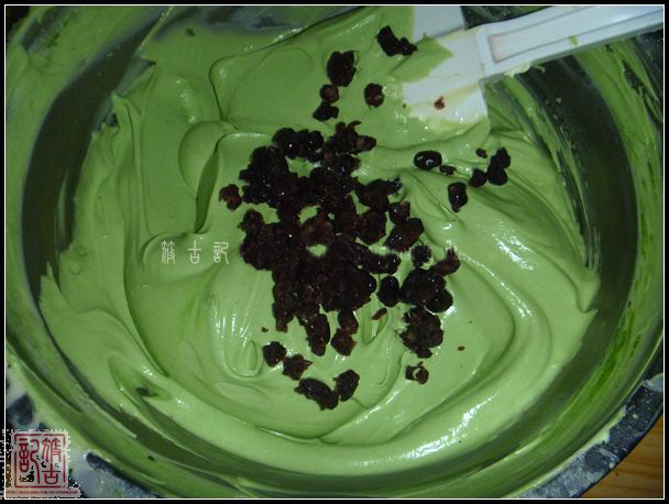3.奶油奶酪微波法軟化,打至順滑.淡奶油加糖,打至6、7分發(fā),兩者混合拌勻。將抹茶加入芝士糊拌勻,抹茶和芝士的量可以適當調(diào)整,將蜜紅豆加入,拌勻。