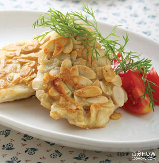 材料:杏仁片100g、鯛魚片2片、杏仁粉2大匙、雞蛋1顆