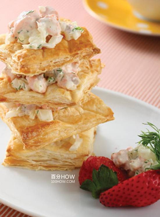 4、每片烤過的起酥皮上分別放上1份鮭魚丁餡,再把起酥皮迭起即可。