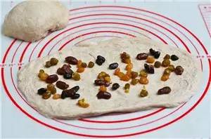 ⑦抹上醬,我用的是紅薯泥,撒切碎的核桃仁和葡萄干、奶酪(也可以直接用紅豆沙和蜜紅豆);
