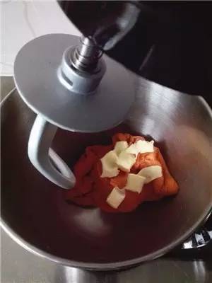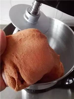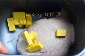 ①面團(tuán)部分除黃油揉到光滑后,加入黃油揉至拓展階段,靜置發(fā)酵;