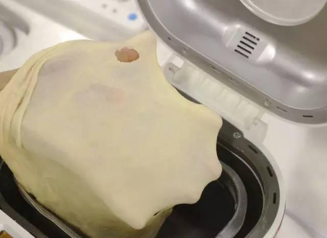 7.慢慢地撐開,可以看到面團形成了一張薄薄的膜,但是再拉扯的話就容易裂出不規(guī)則的洞,這個時候就到達了傳說中的擴展階段,一般的面包達到這個階段就可以了。