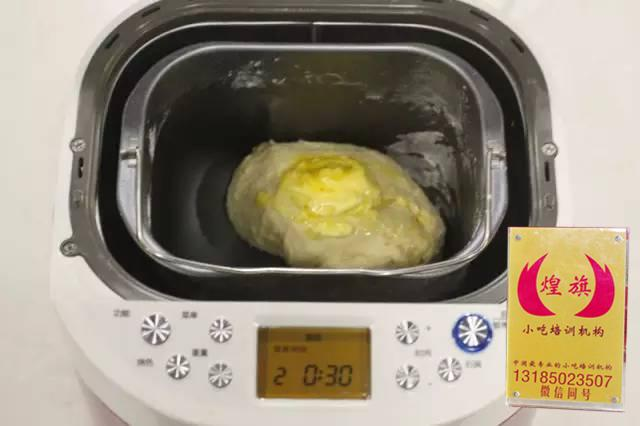 8.將揉好的面團整圓放入盆中進行發(fā)酵工序。(整個揉面過程花費了偶將近45分鐘,如果沒有體力,沒有耐心的煌旗小編建議還是去買個面包機,十幾分鐘就可以搞定)
