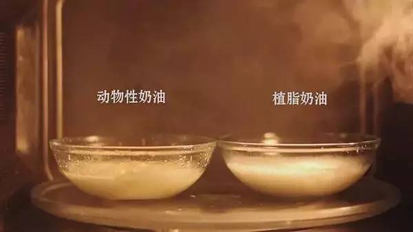 分別稱取相同重量的動(dòng)物性奶油、植脂奶油,置于玻璃碗中,放到微波爐高火加熱2分鐘。