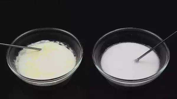 將動(dòng)物性奶油和植脂奶油分別倒入玻璃碗中,觀察顏色。