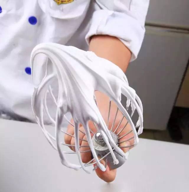 3、濕性打發(fā):若攪拌球頂部的鮮奶油尖峰狀彎曲弧度較大,則打發(fā)不到位,這種奶油抹面很難抹得直且頂部放東西時(shí)易塌陷變形。