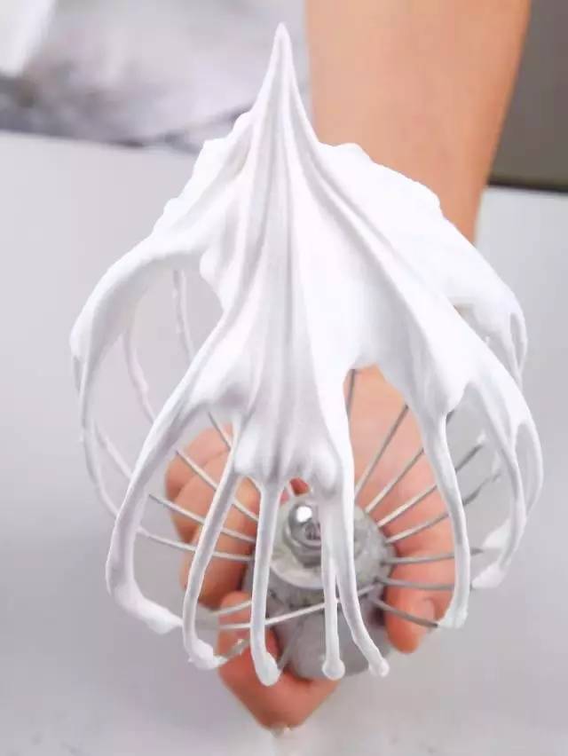 4、中性打發(fā):若攪拌球頂部的鮮奶油尖峰呈直立狀,則打發(fā)到位這樣的奶油就能用來抹面擠花了,但如果打的太過(連尖都帶不出來)鮮奶油就會(huì)有很多氣泡抹面時(shí)會(huì)顯得很粗糙。