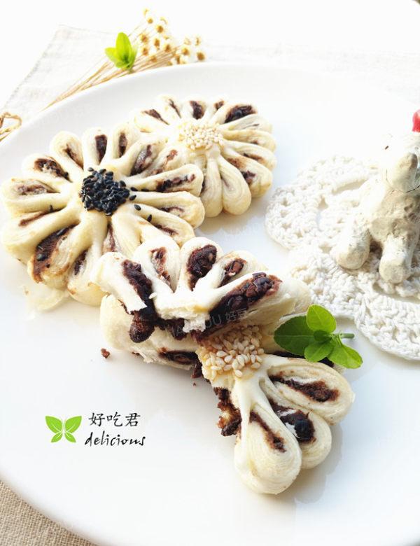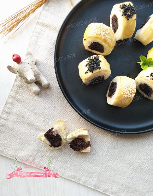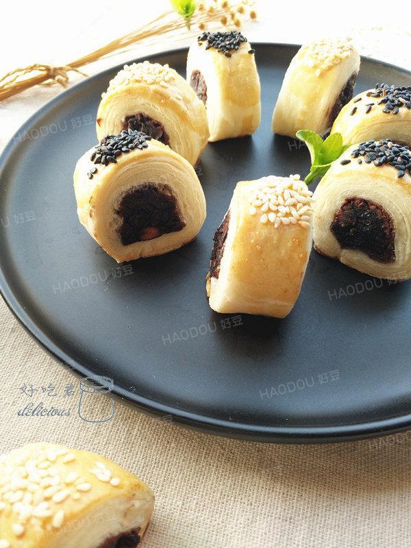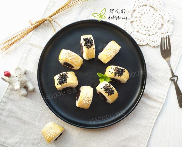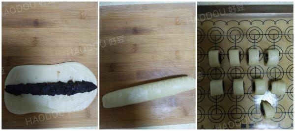 3.將面團(tuán)搟開(kāi),搟長(zhǎng),放入豆沙餡,收口包好。切成大小均勻的塊兒狀。