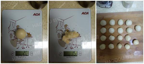2.水油皮分成20g一個(gè),油酥面團(tuán)分成15g一個(gè),共九份。