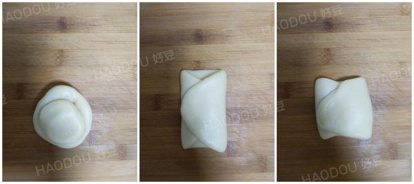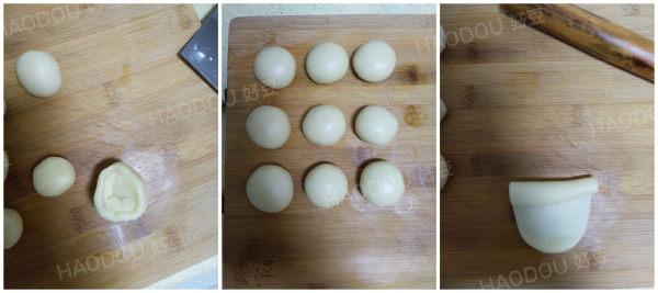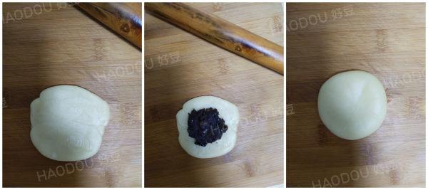 5.兩端收口,按扁搟開(kāi),放入7g的豆沙餡,收口包好。