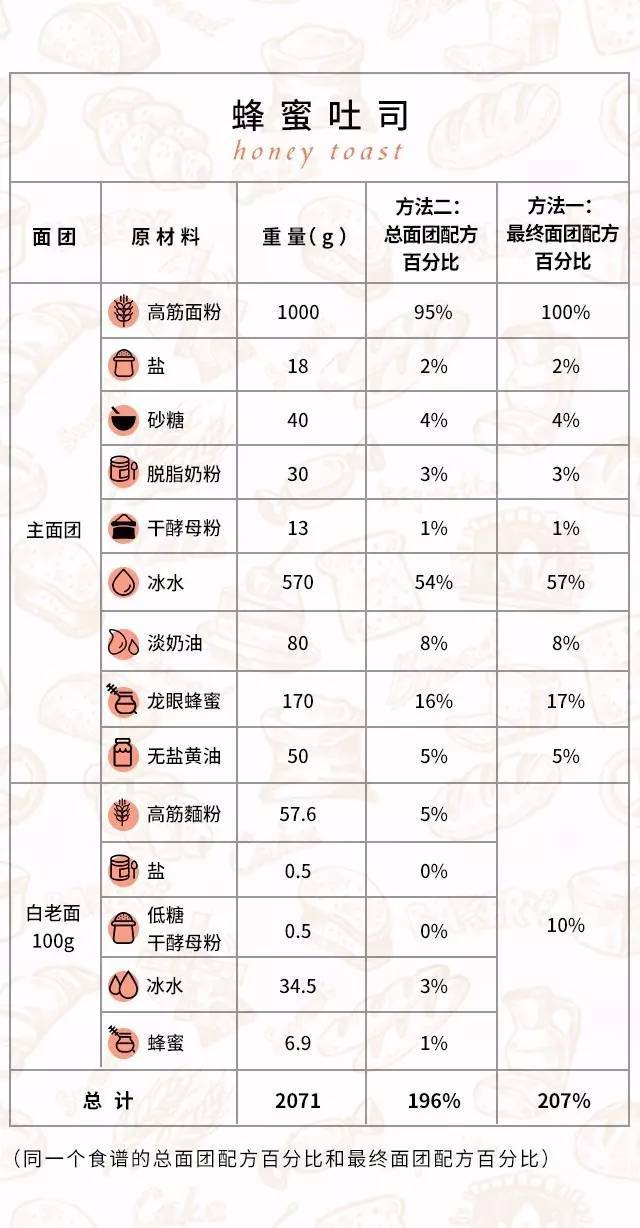 如:一般食鹽通常占面粉總重量的1.5%-2.5%;以上白吐司配方中,鹽的百分比為2%,表明食鹽比例在合適的范圍之內(nèi)。