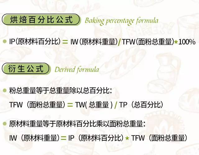 烘焙百分比,就是配方中所用原料的份量與面團中面粉總量的比例。所有原材料都是根據(jù)面粉總重量(TFW)進行計算的,TFW相當于100%,其他所有原材料的比例都是根據(jù)這個數(shù)據(jù)計算出來的。