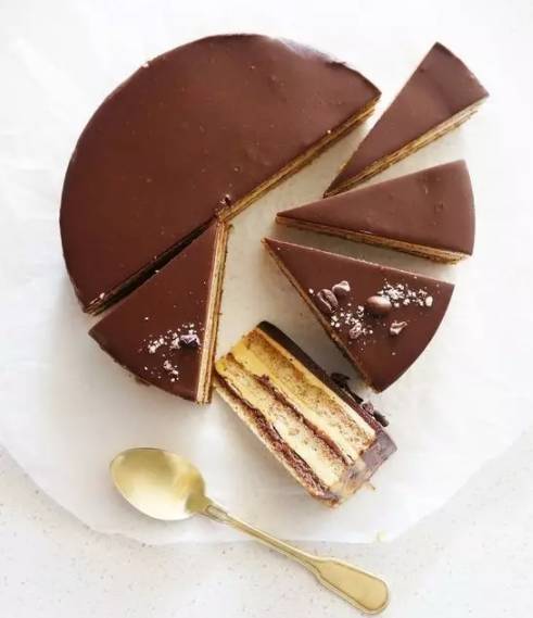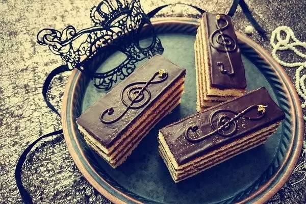 歌劇院蛋糕也叫歐培拉(opera),蛋糕師會(huì)在鋪了巧克力淋面的蛋糕面上畫音樂符號(hào),使得每一種設(shè)計(jì)的蛋糕充滿了歌劇院的色彩