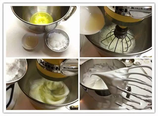 5.蛋白先用打蛋器打出一些泡沫,然后加入檸檬汁及糖(分3次加入)打成尾端挺立的蛋白霜(干性發(fā)泡)