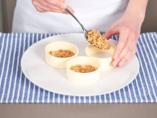 4、將餅干屑混合物鋪在烤模底部,壓實。
