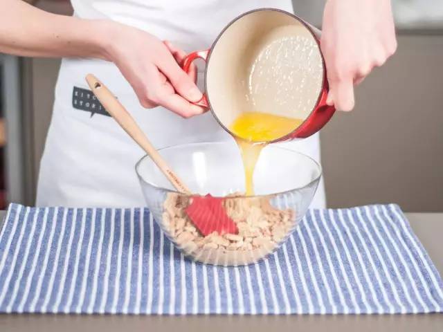 3、在小鍋中用中低溫融化黃油。將餅干屑放入碗中,加入罌粟籽,再注入融化后的黃油并攪拌均勻。