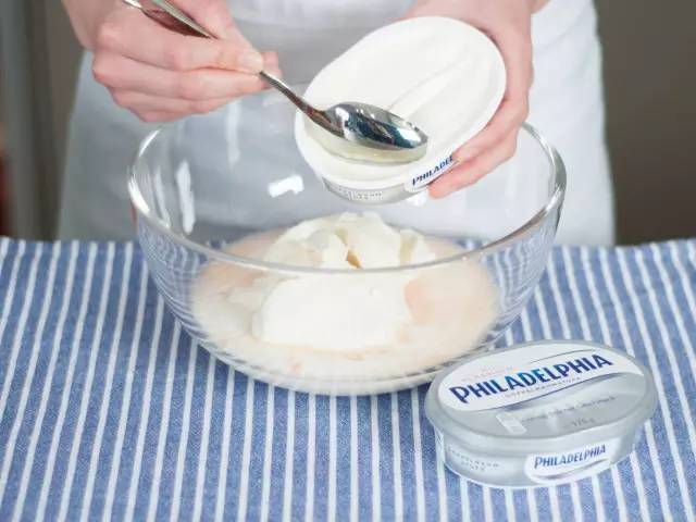 7、將奶油奶酪與酸奶放入大碗中,攪拌均勻。將食用明膠混合物注入奶油奶酪混合物中,并再次攪拌均勻。