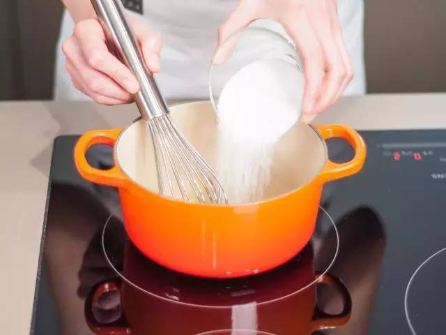 6、將浸透的食用明膠、水與糖一同加入平底鍋中,用中低溫緩慢加熱,并持續(xù)攪拌,注意溫度不要過高。待食用明膠與糖完全溶解后,停止加熱,冷卻備用。