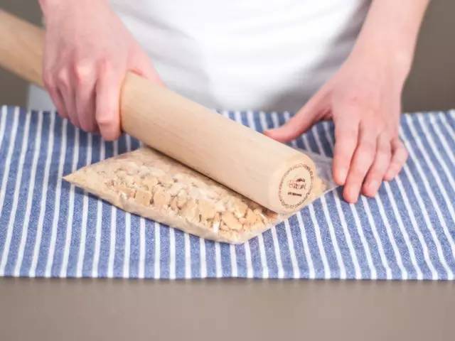 2、將餅干放入冷凍袋,密封后用搟面杖將餅干壓碎。