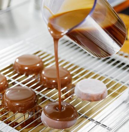 在每一次使用之前要保證淋面的溫度是適合淋面的,在30℃~35℃之間,在達(dá)到溫度的同時(shí),要保證淋面的粘稠度適宜,如果太稠就不能使用了。