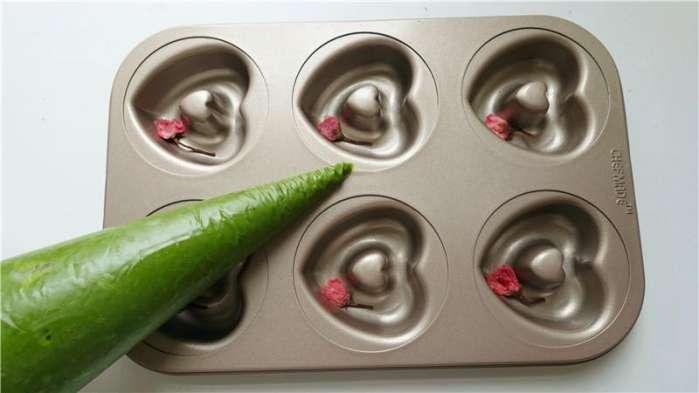 14.將做好的面糊,裝入裱花袋,擠入模具八分滿。