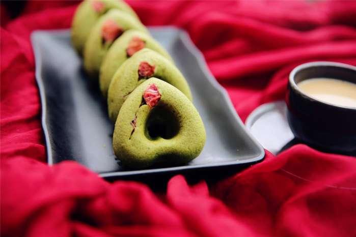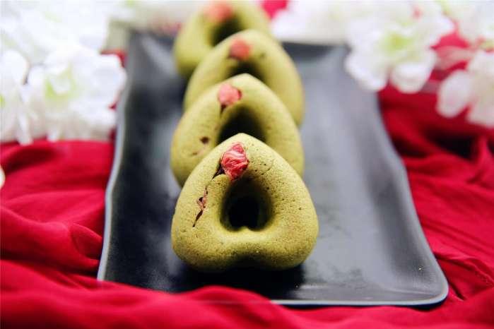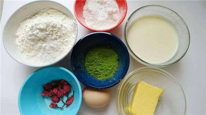 無鹽黃油50克,糖粉60克,雞蛋一個,低粉190克,抹茶粉 10克,牛奶120g,泡打粉一小勺,鹽漬櫻花 適量。