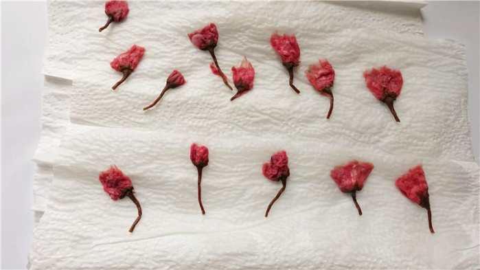 3.將鹽漬櫻花換水多泡洗幾次,去掉鹽味,用廚房用紙吸干水份備用。
