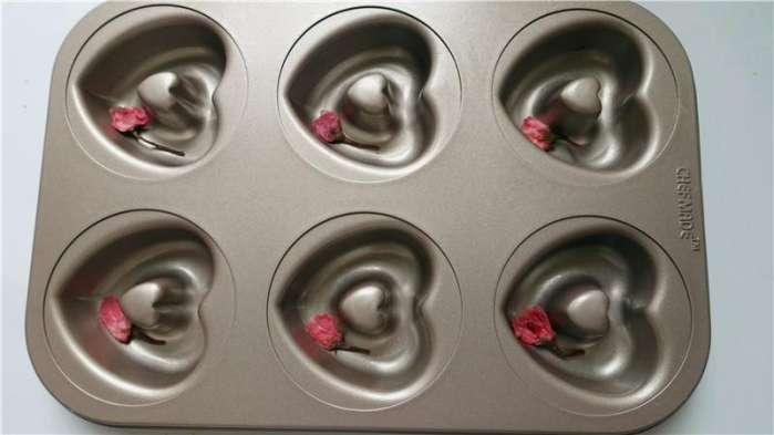 13.將吸干水份的櫻花擺放在學(xué)廚心形模具上。