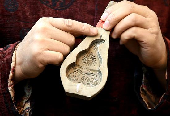 張忠強(qiáng)表示,好的糕點(diǎn)模具,外觀造型尤其重要,并詳細(xì)講解了一件葫蘆糕點(diǎn)模的花紋雕刻。葫蘆是傳統(tǒng)文化中最重要的造型,八仙法器之一,寓意福祿,從雕刻工藝到造型、花樣、刀法都非常講究,尤其是半月牙兒,這么精細(xì)的雕刻,而且是這么簡單原始的工藝,非常不易,在當(dāng)年,一定需要幾天的時(shí)間才能完成。