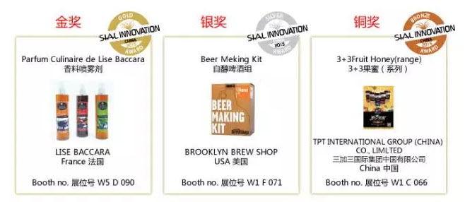 基于以上的消費(fèi)主軸及副軸,2015年SIAL創(chuàng)新大賽共評選出94個創(chuàng)新產(chǎn)品。其中11項產(chǎn)品入圍決賽,最終評選出金銀銅3個大獎。法國LISE BACCARA公司的香料噴霧劑榮獲金獎;美國BROOKLYN BREW SHOP公司的自釀啤酒組榮獲銀獎;三加三國際集團(tuán)(中國)有限公司的3+3果蜜(系列)榮獲銅獎。 白酒 www.tangjiu.com