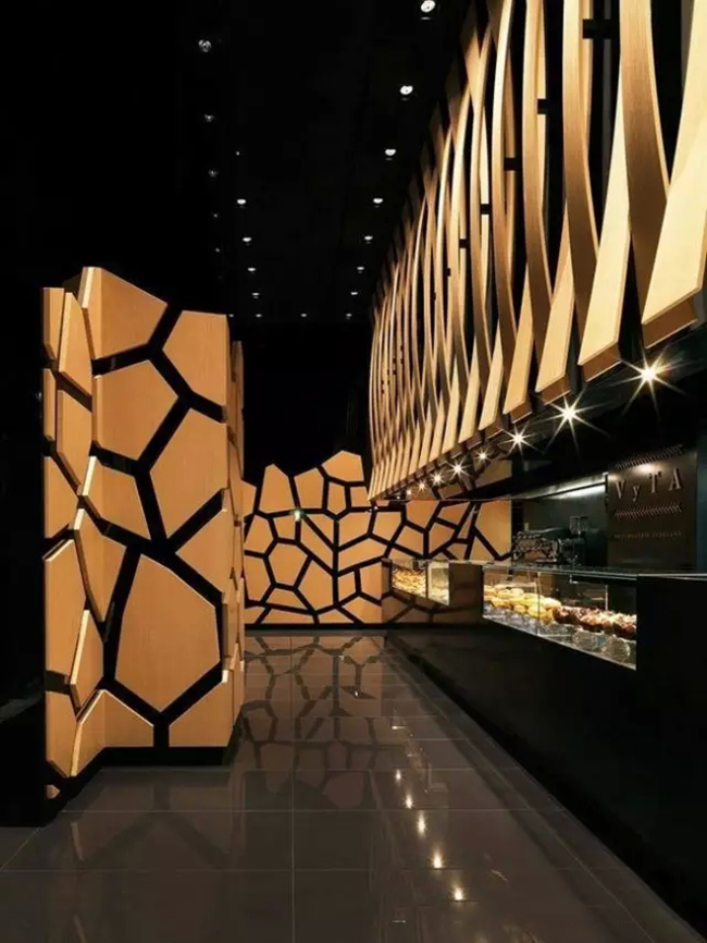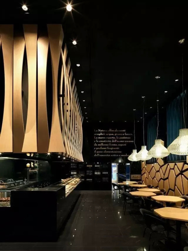 這個以黑色為基調(diào)的面包店,用淡色的橡木組成幾何形的鏤空墻面,吧臺上方則采用了橡木條彎曲成統(tǒng)一的弧度,在燈光下,這個空間如同永不退幕的意大利戲劇一般,充滿張力。