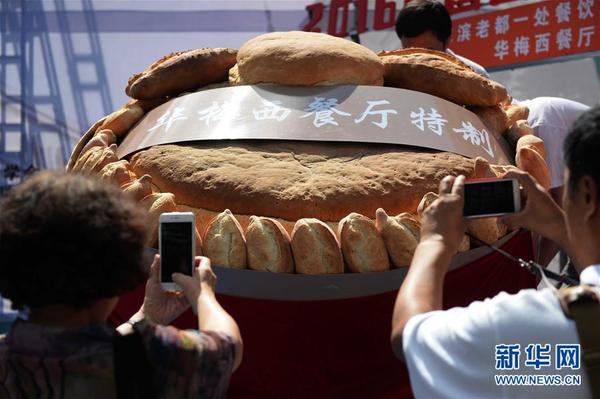 6月25日,市民在拍攝開(kāi)幕式上展示的俄式傳統(tǒng)面包——大列巴。當(dāng)日,第二屆中國(guó)國(guó)際西餐文化節(jié)暨第三屆哈爾濱西餐美食節(jié)在黑龍江哈爾濱市中央大街上開(kāi)幕。 新華社記者王凱攝