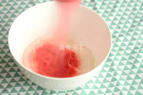 4. 在其中三份打發(fā)的奶油中分別篩入搟碎的凍干草莓、凍干藍(lán)莓粉和凍干南瓜,用細(xì)篩篩入,繼續(xù)用打蛋器攪拌均勻;