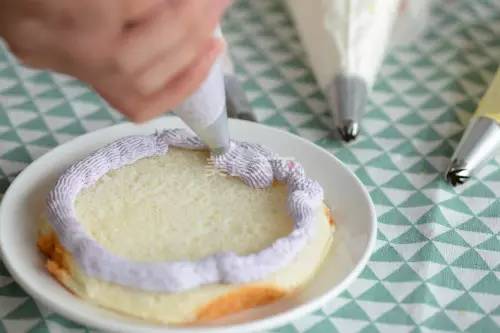 6. 托盤(pán)上放一片之前做好的圓形切片面包,在上面均勻的擠上凍干藍(lán)莓粉混合的奶油;
