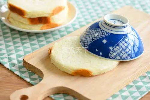 2. 用一個(gè)大小合適的瓷碗將新鮮切片面包扣出圓形,4片即可;