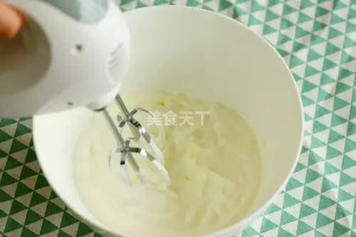 3. 將淡奶油分三次加入砂糖打發(fā),均勻分成四份;