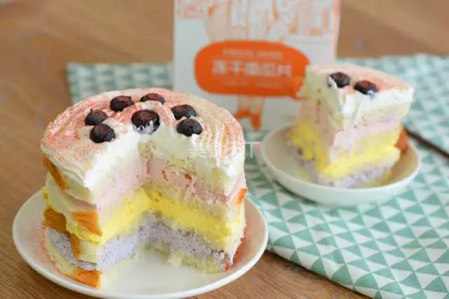 搟碎的凍干水果粉末一定要過(guò)篩,這樣混合奶油后的顏色才會(huì)均勻;記得一定要用新鮮的切片面包,或者自己烘焙蛋糕胚,不過(guò)用切片面包快手又別有一番風(fēng)味。