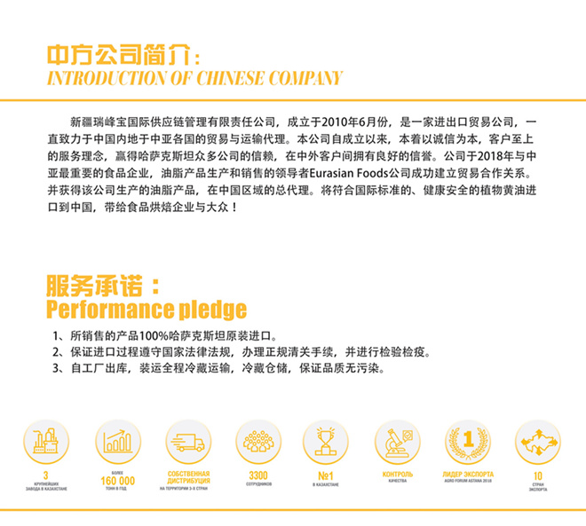 哈薩克斯坦100%原裝進(jìn)口優(yōu)質(zhì)烘焙黃油,不含膽固醇和動(dòng)物脂肪!該產(chǎn)品出口俄羅斯、格魯吉亞、阿塞拜疆、烏茲別克斯坦等哈薩克斯坦周邊國(guó)家。現(xiàn)誠(chéng)征各地經(jīng)銷商,哈經(jīng)理 13579266642.新疆瑞峰寶國(guó)際。