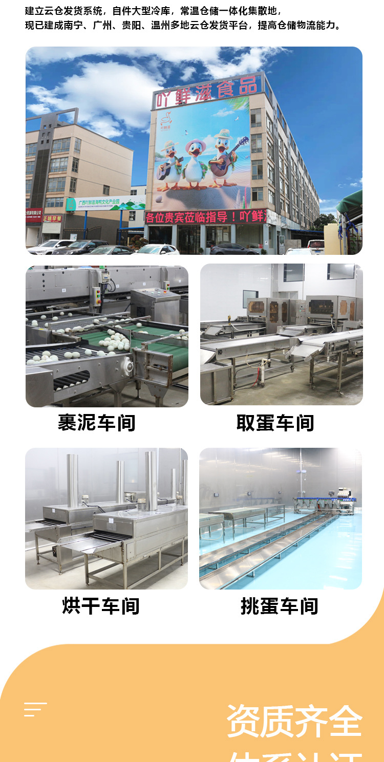 公司位于美麗的海濱城市北海,占地30畝,廠房面積22000平,現(xiàn)有員工500余人,建成現(xiàn)代化海鴨蛋生產(chǎn)線6條,海鴨咸蛋黃生效4條,皮蛋生產(chǎn)車間400平,冷庫儲藏能力8000立方。電話/微信:19377902992。