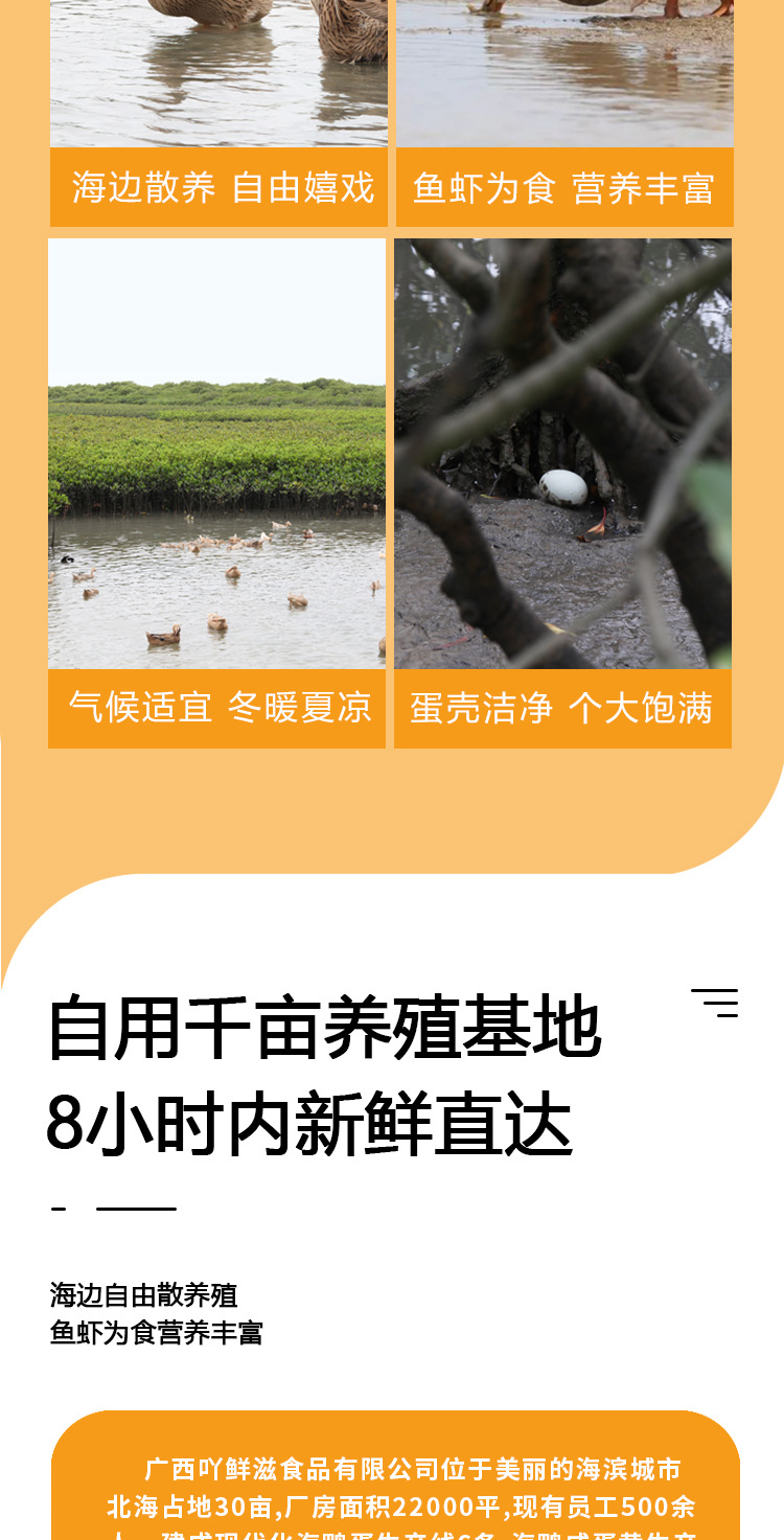 公司位于美麗的海濱城市北海,占地30畝,廠房面積22000平,現(xiàn)有員工500余人,建成現(xiàn)代化海鴨蛋生產(chǎn)線6條,海鴨咸蛋黃生效4條,皮蛋生產(chǎn)車間400平,冷庫儲(chǔ)藏能力8000立方。電話/微信:19377902992。